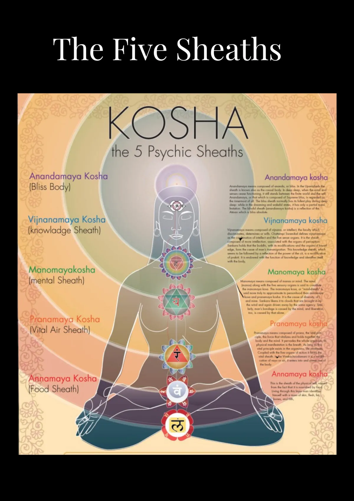 Journey through the seven chakras, layer by layer, from the physical body to the bliss body. Each of the 5 koshas reveal a deeper dimension, guiding you to grounded presence, emotional flow, inner power, heart-opening love, authentic voice, intuition, and pure consciousness.
